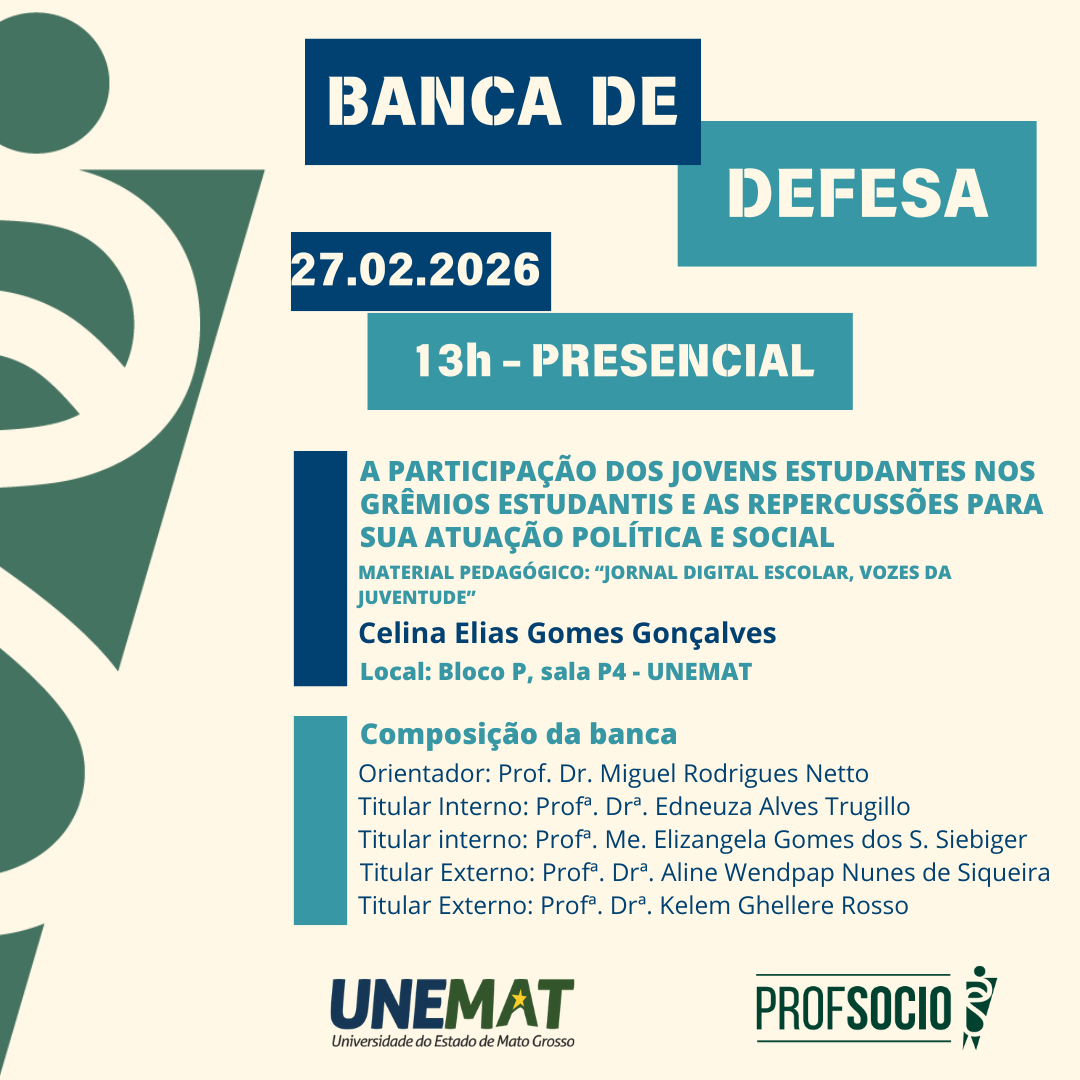 Na próxima sexta-feira, 27 de fevereiro, acontecerá a banca de defesa do Trabalho de Conclusão de Curso de Celina Elias Gomes de Gonçalves. Mestranda do ProfSocio/UNEMAT, Celina apresentará o trabalho intitulado “A Participação dos Jovens Estudantes nos Grêmios Estudantis e as Repercussões para sua Atuação Política e Social”. Como produto educacional, desenvolveu também o material pedagógico “Jornal Digital Escolar: Vozes da Juventude”.