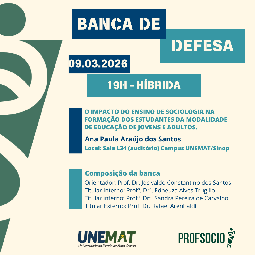 A mestranda Ana Paula Araújo defenderá, no âmbito do Profsocio/UNEMAT, o trabalho de conclusão intitulado: “O Impacto do Ensino de Sociologia na Formação dos Estudantes da Modalidade de Educação de Jovens e Adultos”.