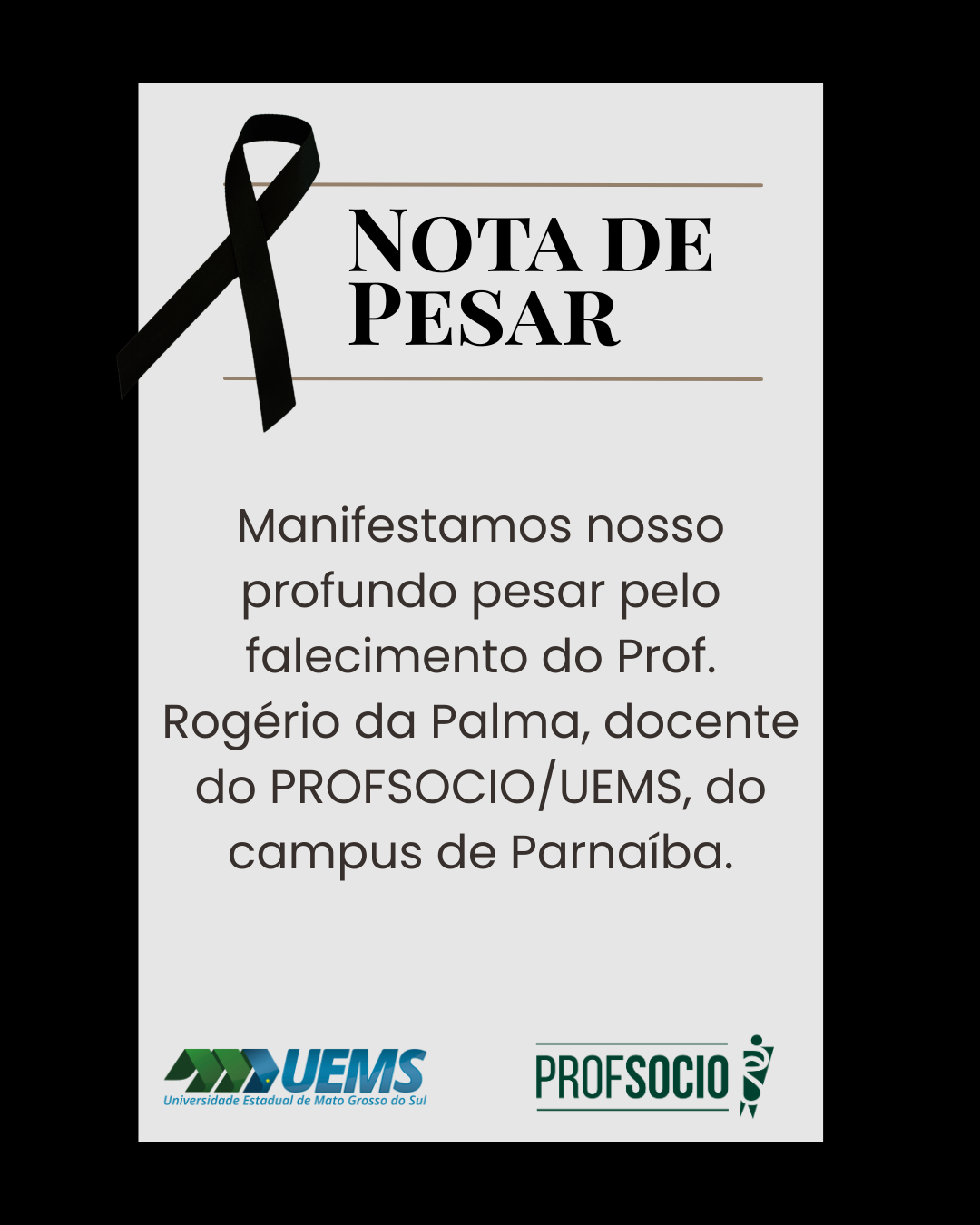Manifestamos nosso profundo pesar pelo falecimento do Prof. Dr. Rogério da Palma, docente do ProfSocio/UEMS do Campus de Parnaíba. Nosso sentimento aos colegas, mestrandos e a todos os familiares. Que a nossa solidariedade traga algum conforto diante deste ciclo doloroso da vida. Recebam nosso abraço.