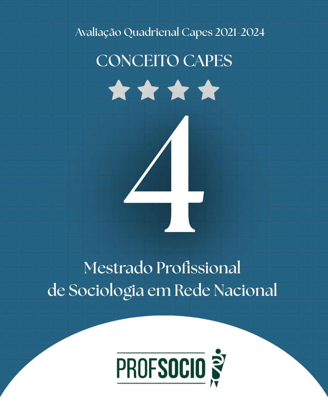 É com grande satisfação que comunicamos que o Mestrado Profissional de Sociologia em Rede Nacional (ProfSocio) obteve nota 4 na Avaliação Quadrienal (2021-2024) da Capes. Esse resultado expressa o reconhecimento da qualidade acadêmica do programa e de sua relevância para a formação de professores e profissionais da área de Sociologia.  A avaliação reflete o esforço contínuo e o trabalho coletivo desenvolvido ao longo dos últimos anos, envolvendo discentes, egressos, docentes e equipes institucionais, que contribuíram de forma decisiva para o fortalecimento do programa, para a consolidação de suas práticas formativas e para a produção de conhecimento comprometido com a educação básica e com a realidade social brasileira.